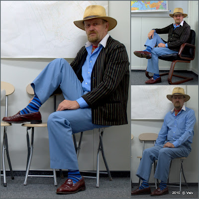 Dla urozmaicenia zestawu doszły jeszcze kolorowe dodatki: w kieszonce koszuli znalazła swoje miejsce jedwabna poszetka w niebieskim kolorze i czerwono granatową kratką - marynarka nie ma odpowiedniej kieszonki. Na stopy trafiły ciepło pomarańczowe skarpetki.